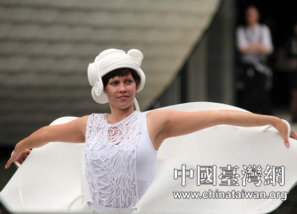 6月11日,上海世博園芬蘭館外,白色舞者為排隊等候入館的游客翩翩起舞,并不時與他們進行互動。在芬蘭館排隊等候入館也成為一種享受。 (中國臺灣網 田云鵬 攝)