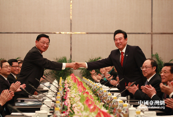 6月29日上午,海協會與臺灣;鶗谥貞c申基索菲特大酒店舉行第五次領導人會談。圖為海協會會長陳云林、;鶗麻L江丙坤親切握手。(中國臺灣網 鐘寶華 攝)
