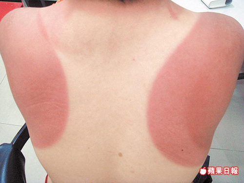 一男子穿著背心在烈日下騎車,導(dǎo)致背部被嚴(yán)重曬傷。圖片來源:臺灣《蘋果日報》