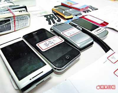 嫌犯鐘國(guó)裕(上圖)為逃避追緝,讓手下帶十多支手機(jī)(下圖),搭高鐵接電話(huà)詐騙。圖片來(lái)源:臺(tái)灣《蘋(píng)果日?qǐng)?bào)》