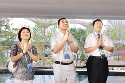 林毅夫(中)偕妻子在點燈水臺許下“美夢成真”、“永保安康”心愿。來源:臺灣《旺報》