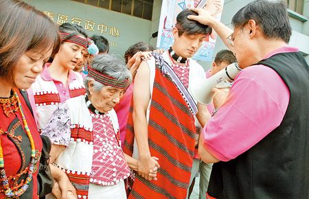 在臺北市選委會外,有臺灣少數民族市議員參選人身著傳統服裝,在耆老與族人的陪同下前往登記。來源:臺灣《中國時報》