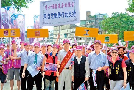 尋求4連霸的臺北縣議員周勝考(中),在士農工商及學生等代表陪同下,一同前往臺北縣選委會登記參選新北市議員。來源:臺灣《中國時報》