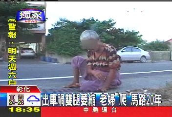 記者在彰化芳苑的大馬路邊,發(fā)現(xiàn)3、4只野狗圍著一個頭發(fā)斑白的老婆婆,她想閃躲,但似乎有困難,因為老婆婆的腳嚴(yán)重萎縮,只能用爬的,而且一爬就是20多年。每天出門,老婆婆就在馬路上爬,旁邊車子一臺臺呼嘯而過,記者看了都替她捏把冷汗。