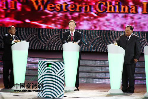 中國(guó)臺(tái)灣網(wǎng)10月22日成都消息 第十一屆中國(guó)西部博覽會(huì)(以下簡(jiǎn)稱“西博會(huì)”)開(kāi)幕式今日上午9時(shí)在四川省成都市錦江大禮堂隆重舉行。中共中央政治局委員、國(guó)務(wù)院副總理王岐山,全國(guó)人大常委會(huì)副委員長(zhǎng)陳昌智,全國(guó)政協(xié)副主席白立忱出席開(kāi)幕式。