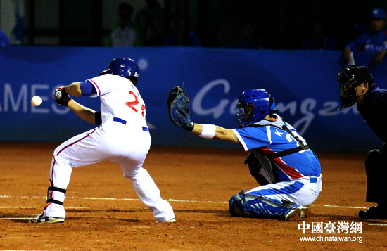 廣州亞運棒球決賽今晚進行,中華臺北隊與韓國隊爭奪金牌。圖為中華臺北隊擊球。(中國臺灣網 沈鵬 攝)