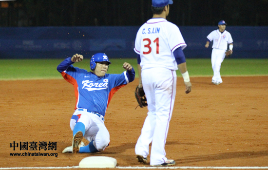 廣州亞運棒球決賽今晚進行,中華臺北隊與韓國隊爭奪金牌。圖為韓國隊上壘。(中國臺灣網 沈鵬 攝)