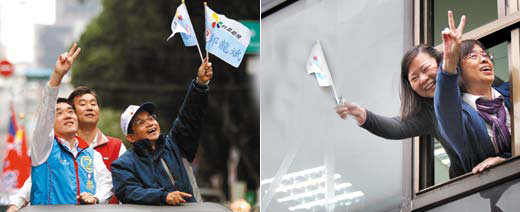 選舉倒數(shù)3天,臺北市長候選人郝龍斌昨天在中正區(qū)進(jìn)行“車隊(duì)掃街”,支持者從高樓窗戶探頭出來為他加油打氣。記者陳柏亨/攝影 圖片來源:臺灣《聯(lián)合報(bào)》