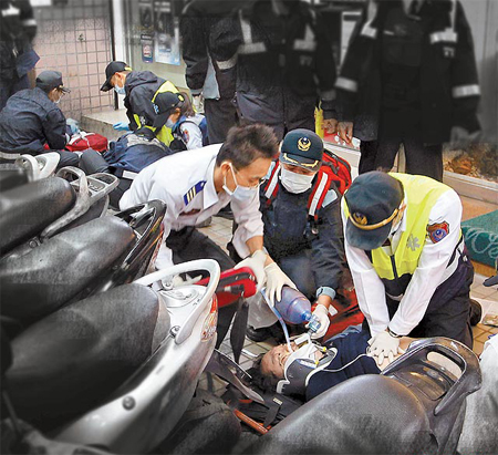 臺北縣中和市“金年春金仔店”銀樓遭搶,兩名嫌犯一人中彈(后)、一人猝死(前),警方在現場進行搶救。 來源:臺灣媒體