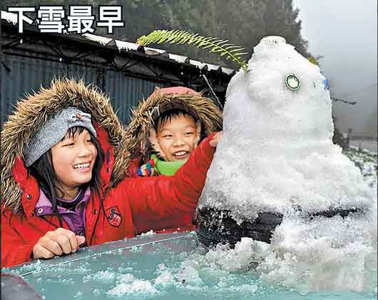 宜蘭縣與臺中縣交界的臺7甲線思源埡口附近昨清晨飄下全臺第一場瑞雪,孩童高興地堆起小雪人玩樂。圖片來自網絡
