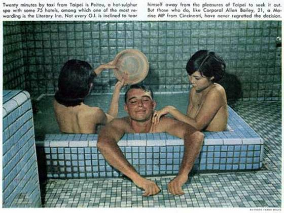 中國臺灣網(wǎng)3月2日消息 據(jù)臺灣“今日新聞網(wǎng)”報道,一張歷史照片也許可以牽扯出一段復(fù)雜的歷史。1967年12月22日,美國《時代雜志》刊登了一篇敘述駐越南美軍有5天海外“特別假”的報道。文中特別提到讓美軍放假時間“消遣”的幾個都市,其中便包括臺北。在介紹臺北時,《時代雜志》刊登了一張北投區(qū)(臺北市最北方,聞名遐邇的是北投溫泉)女服務(wù)生陪浴的照片。這張照片使得臺北久久無法擺脫“買春之城”的印象,蔣介石看到報道后也勃然震怒。