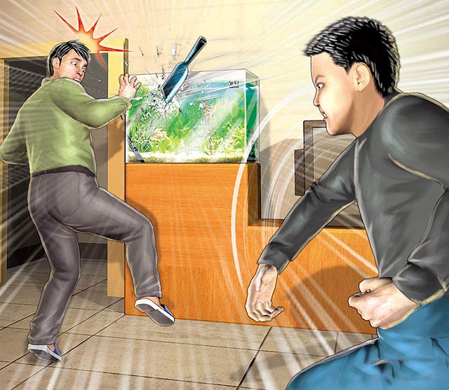 林姓少年因養父拒絕幫他養小孩,竟從背后射飛刀暗算養父,幸射破水族箱未傷及養父。圖片來源:臺灣媒體