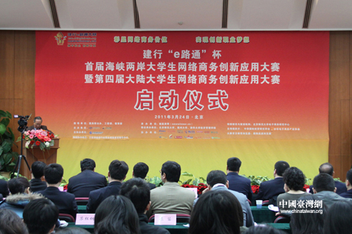 3月24日上午,由中國互聯(lián)網(wǎng)協(xié)會和中國臺灣網(wǎng)共同主辦的“建行e路通杯首屆海峽兩岸大學(xué)生網(wǎng)絡(luò)商務(wù)創(chuàng)新應(yīng)用大賽暨第四屆大陸大學(xué)生網(wǎng)絡(luò)商務(wù)創(chuàng)新應(yīng)用大賽”在京舉行啟動儀式。主辦方表示,期望能借此加強兩岸互聯(lián)網(wǎng)業(yè)界、以及高校學(xué)生的交流借鑒,促進共同發(fā)展。(中國臺灣網(wǎng) 王偉 攝)