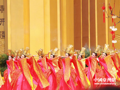 樂舞敬拜環節,舞者金色高冠、大紅色鑲金邊的華服古色古香。(中國臺灣網 馬迪 攝)