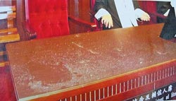 上午11時5分,法官開完庭,法警準備為3名被告上腳鐐手銬時,坐在被告席中間的黃詩斌突然“吼”的一聲起身,撒了一把胡椒粉,轉身跳上旁聽席。