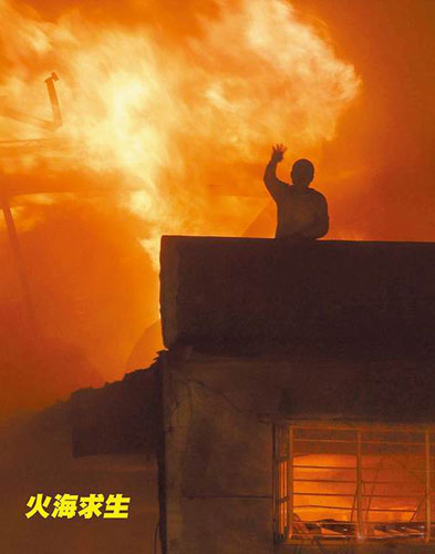 一名男子受困頂樓,顧不得濃煙嗆人,向警消揮手求救。圖片來自網絡