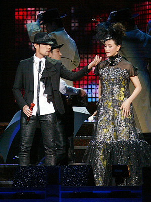 大陸著名歌唱家宋祖英(右)8日在臺北小巨蛋舉行演唱會,并與藝人周杰倫(左)同臺高歌,歌聲動人。圖片來源:臺灣媒體