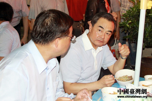 王毅品嘗臺灣特色美食——牛肉面,并與銷售業(yè)者親切交談。(中國臺灣網 王偉 攝)