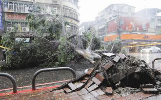 受到臺(tái)風(fēng)“米雷”外圍環(huán)流影響,新北市板橋、土城區(qū)一帶上午降下傾盆大雨。疑似雨勢(shì)太大導(dǎo)致土質(zhì)松軟,土城區(qū)樂利國(guó)小前的一棵路樹被連根拔起。圖片來源:臺(tái)灣《聯(lián)合報(bào)》