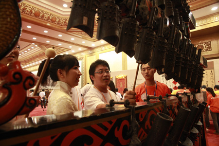 兩岸青年參觀中華非物質文化遺產編鐘展示并親自體驗(中國臺灣網 普燕 攝)