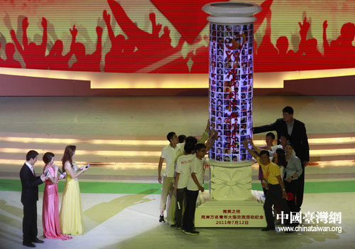 由中共中央臺辦、共青團中央等17家單位共同主辦的兩岸萬名青年大交流活動,7月上旬在大陸各地陸續(xù)展開。兩岸青年大型交流主題聯(lián)歡活動分為“我們同根”“我們同心”“我們同行”三個篇章,包括歌曲、舞蹈、武術(shù)、魔術(shù)等豐富多彩的文藝節(jié)目。孫楠、陳楚生、周杰倫、李宇春、林宥嘉、韓紅、成龍、宋祖英等一批深受兩岸青年喜愛的文藝明星先后登場,為大家獻上一首首耳熟能詳?shù)木哂兄腥A傳統(tǒng)文化底蘊的歌曲,劉謙的魔術(shù)、河南少林寺武術(shù)、臺灣少數(shù)民族舞蹈、中國殘疾人藝術(shù)團的“千手觀音”也贏得現(xiàn)場觀眾的陣陣歡呼聲。