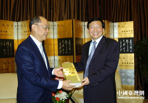 陜西省常務副省長婁勤儉向臺灣太平洋文化基金會董事長錢復贈送禮品。(陜西省臺辦 張群莉 攝)