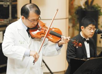中國(guó)臺(tái)灣網(wǎng)11月9日消息 據(jù)臺(tái)灣《聯(lián)合報(bào)》報(bào)道,臺(tái)大醫(yī)院昨天舉辦醫(yī)師節(jié)感恩音樂(lè)會(huì),擔(dān)綱的主角一位是執(zhí)行換腎手術(shù)的臺(tái)大外科醫(yī)師蔡孟昆,一位是換腎的音樂(lè)家莊天岳,醫(yī)病兩人合奏“愛(ài)的禮贊”,贏得滿堂采;蔡孟昆說(shuō),他已走出誤植艾滋器官事件的低潮期,靠的就是拉小提琴減輕壓力。
