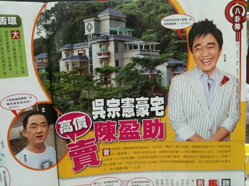 中國(guó)臺(tái)灣網(wǎng)11月30日消息 據(jù)臺(tái)灣媒體報(bào)道,地下賭盤總賭頭陳盈助從島內(nèi)政壇延燒到文藝界,今天出刊的臺(tái)灣《壹周刊》報(bào)道,藝人吳宗憲今年為周轉(zhuǎn)公司財(cái)務(wù),急售臺(tái)北挹翠山莊的豪宅,曾委托房仲欲賣新臺(tái)幣4億多元,始終找不到買主。