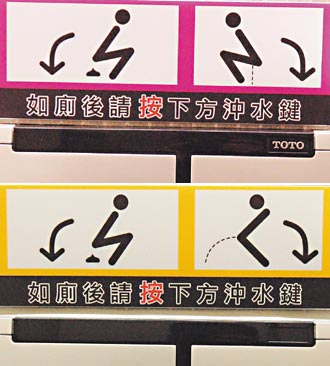 中國(guó)臺(tái)灣網(wǎng)12月14日消息 據(jù)臺(tái)灣《聯(lián)合報(bào)》報(bào)道,臺(tái)中市廁所前天貼出新圖示,提醒“如廁后請(qǐng)按沖水鍵”,用簡(jiǎn)潔線條模擬蹲馬桶的動(dòng)作,搭配“便便”、“噓噓”圖案,引發(fā)熱烈討論。臺(tái)中市政府贊廁所圖示“動(dòng)感寫實(shí)”,但大部分民眾則說(shuō)“風(fēng)格年輕,表達(dá)過(guò)于直接”。(中國(guó)臺(tái)灣網(wǎng) 張真瑜)