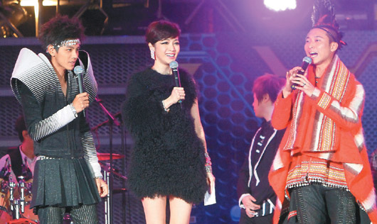 2012臺北最HIGH跨年晚會昨天舉行,浩角翔起與侯佩岑(中)擔任晚會主持人。(圖片來源:臺灣《聯合報》)