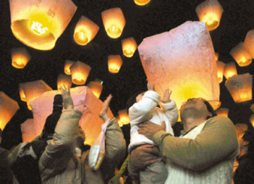 一家三口欣賞天燈美景。(圖片來源于:臺灣《聯(lián)合報》)