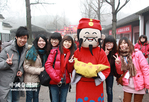 臺灣學生和大陸高校志愿者在虎丘門前合影。(中國臺灣網 栗琰 攝)