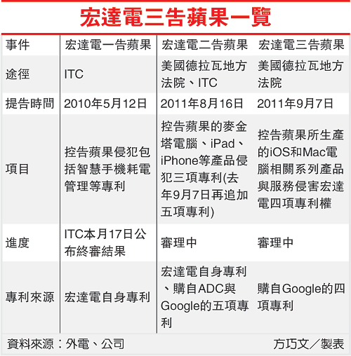 至于蘋果去年3月在ITC一告宏達電之案,已在去年底公布終審,ITC認為宏達電僅侵犯蘋果一項專利。由于該專利易規避,市場認為ITC終審結果是讓宏達電贏了里子,蘋果則不是真正的贏家。(中國臺灣網 劉海偉)