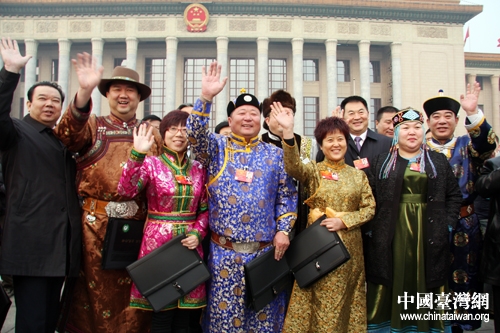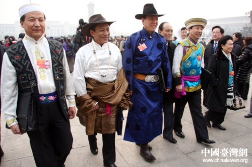 十一屆全國(guó)人大五次會(huì)議5日上午在北京開(kāi)幕,來(lái)自全國(guó)各地的少數(shù)民族代表們身著民族盛裝步入大會(huì)堂。(中國(guó)臺(tái)灣網(wǎng) 王偉 攝)
