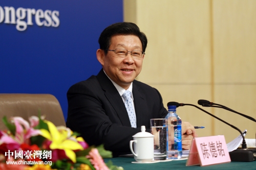 十一屆全國人大五次會議7日在梅地亞中心舉行記者會,商務部部長陳德銘就“擴消費促流通和發展對外經貿”的相關問題回答中外記者的提問。圖為會議開始前,陳德銘向記者微笑致意。(中國臺灣網 王偉 攝)