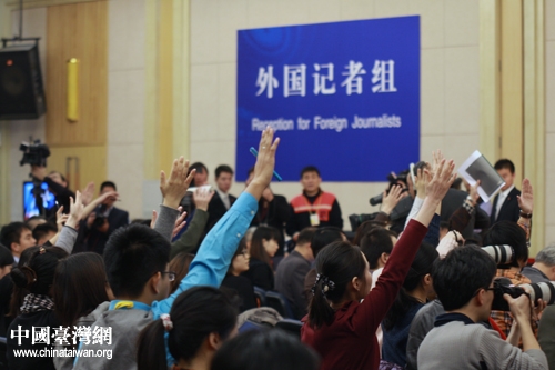 十一屆全國人大五次會議7日在梅地亞中心舉行記者會,商務部部長陳德銘就“擴消費促流通和發展對外經貿”的相關問題回答中外記者的提問。圖為提問現場。(中國臺灣網 王偉 攝)