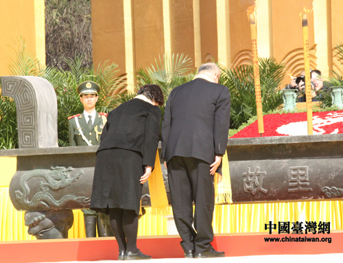壬辰年黃帝故里拜祖大典于3月24日上午在河南新鄭市隆重舉行,圖為中國國民黨榮譽(yù)主席吳伯雄偕同夫人戴美玉上香禮畢后向黃帝像鞠躬致敬。(中國臺灣網(wǎng) 王文英 攝)
