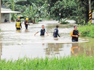 臺灣南部暴雨成災 消防人員在水深及腰的溪畔果園找尋受困民眾。(圖片來自臺媒)