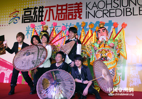 高雄副市長劉世芳與五月天、電音三太子一起為推介高雄旅游站臺。