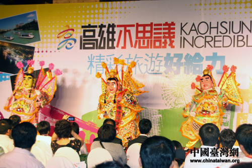 緣起于高雄并流行于臺灣的藝術表演,傳統和現代元素結合的“電音三太子”,因中共中央總書記胡錦濤曾在出席兩岸萬名青年交流活動時,一時興起學起電音三太子的招牌動作,而受到祖國大陸同胞的喜愛,此次電音三太子現身在新聞推介會上,表演了Sorry、Nobody等大家耳熟能詳的歌曲,同與會者進行近距離的互動。此外,代表團還帶來剛剛評鑒出爐的高雄精品,包括中外餅鋪中外棋餅、旗山形象商好蕉情——香蕉旺來酥等精美伴手禮,以及高雄觀光、購物、在地美食、宗教洗禮和相關服務的詳細推介手冊,展現高雄熱情、繽紛的城市魅力。