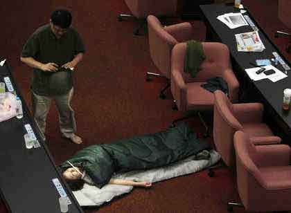 段宜康則自備露營專用的睡墊和枕頭,但熟睡后踢被,還露出一大截肚子,也全被民進黨內同志們拍下照片。(中國臺灣網 劉海偉)