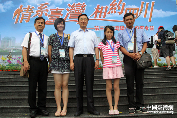 劉奇葆與前來參加第三屆“臺灣學生天府夏令營”活動的一家合影留念。(中國臺灣網 王偉 攝)
