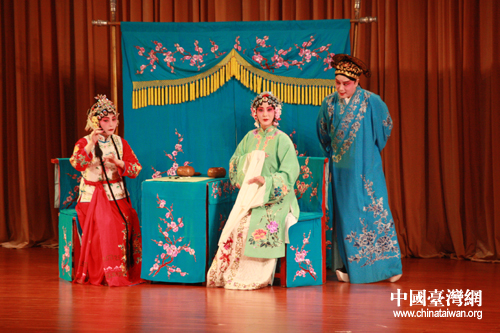 臺(tái)灣師范大學(xué)昆曲研究社、中華昆曲藝術(shù)協(xié)進(jìn)會(huì)常務(wù)理事蔡孟珍女士(左)與浙江昆劇院洪倩(中)、李公律(右)共同出演《西廂記·跳墻著棋》。(中國(guó)臺(tái)灣網(wǎng) 孟雅詩(shī) 攝)
