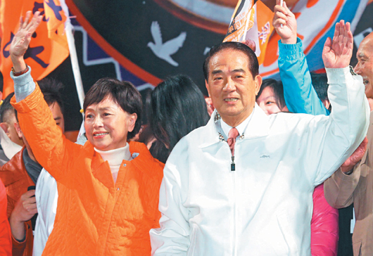 今年1月13日臺灣地區領導人選舉的選前之夜,親民黨候選人宋楚瑜(右)和夫人陳萬水(左)同臺造勢,現場氣氛溫馨感人;相隔才半年,陳萬水卻已病逝。(來源:臺灣《聯合報》)