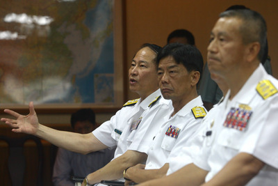 臺(tái)軍海軍司令董翔龍上將(左)6日率領(lǐng)相關(guān)人員出席記者會(huì),說明臺(tái)灣168艦隊(duì)隊(duì)長(zhǎng)張鳳強(qiáng)少將逾越操演范圍的經(jīng)過。圖片來源:臺(tái)灣“今日新聞網(wǎng)”