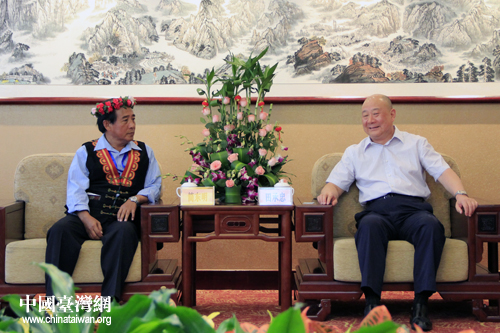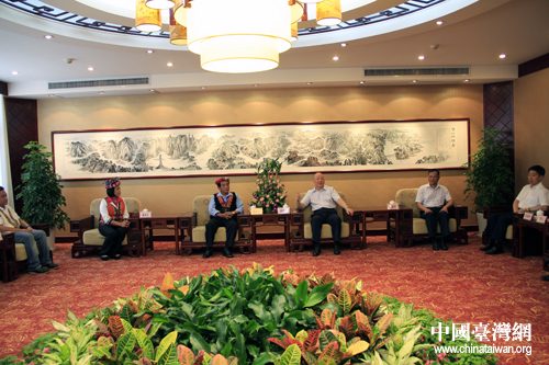 湖北省副省長田承忠25日下午在恩施會見了率臺灣少數(shù)民族代表前來參加恩施女兒會的中華海峽兩岸少數(shù)民族交流協(xié)會理事長簡東明一行。(中國臺灣網 楊麗 攝)