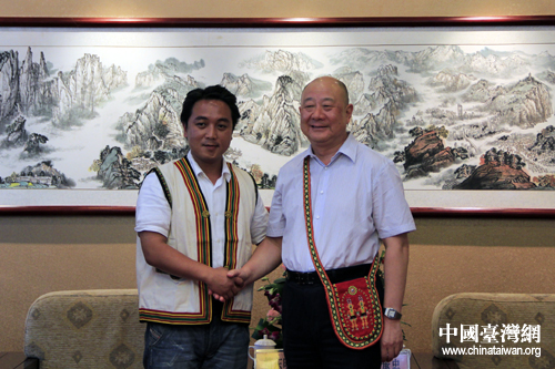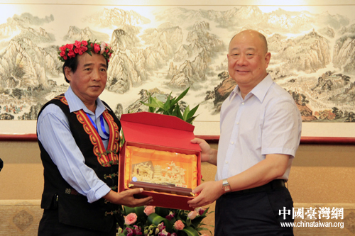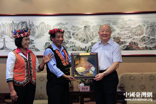 湖北省副省長田承忠25日下午在恩施會見了率臺灣少數(shù)民族代表前來參加恩施女兒會的中華海峽兩岸少數(shù)民族交流協(xié)會理事長簡東明一行,會后雙方互贈禮物。(中國臺灣網 楊麗 攝)