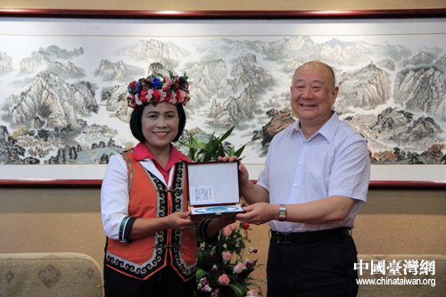 湖北省副省長田承忠25日下午向臺灣少數(shù)民族代表賴錦花贈送禮物。(中國臺灣網 楊麗 攝)