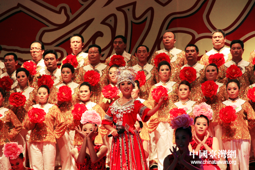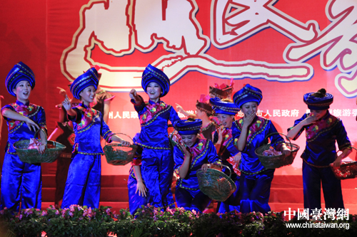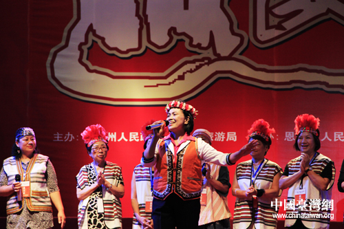 恩施市山民歌匯25日晚間上演,圖為臺(tái)灣少數(shù)民族代表登臺(tái)表演。(中國臺(tái)灣網(wǎng) 楊麗 攝)