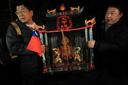 臺灣保釣協會秘書長黃錫麟(左)、理事長謝夢麟(右)帶著媽祖神像抵達新北市深澳漁港。(圖片來自臺媒)